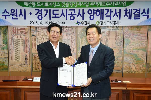 ▲ 수원시, 경기도시공사와 주택개보수지원 사업 협약수원시는 15일 수원시청 상황실에서 경기도시공사와 매산동 도시르네상스 주택개보수 지원 사업 추진을 위한 업무협약을 체결했다.