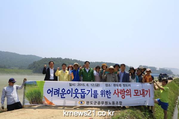 완도군공무원노동조합(위원장 추교상)에서는 지난 12일, 완도읍 정도리에서 신우철 완도군수를 비롯한 조합원 20명이 참여한 가운데 “사랑의 모내기”를 실시하였다.