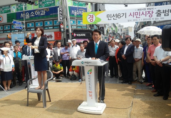 ▲ 지난해 7월1일 이근규 제천시장이 중앙시장 차없는 거리에서 민선6기 취임사을 하고 있다.