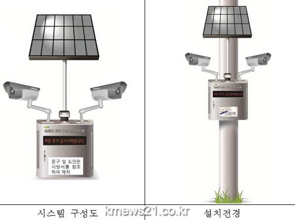 태양광 감시카메라는 공사비용이 기존 감시카메라보다 저렴하고 한 장소의 카메라가 2채널로 구성되어 사각지대를 최소화했으며 화질을 130만화소로 높여 투기자의 용모 및 차량번호 식별이 가능하도록 설계·제작했다.