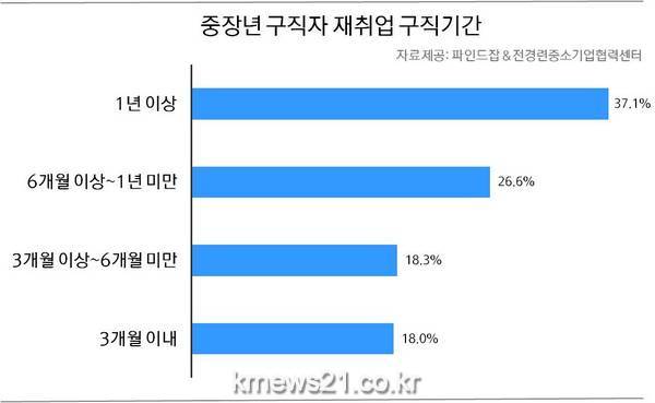 퇴직 후 ‘1년 이상’의 장기 구직자가 37.1%(‘1년~2년’ 20.2%, ‘2년 이상’ 16.9%)로 가장 높은 수치를 드러냈다. 이어 △’6개월~1년 미만’(26.6%), △'3개월~6개월 미만’(18.3%), △‘3개월 이내’(18%)순으로 조사됐다.