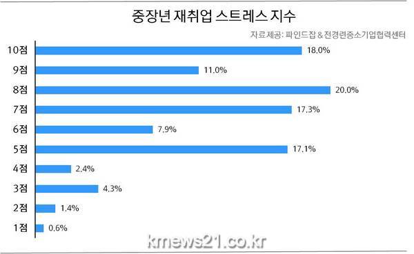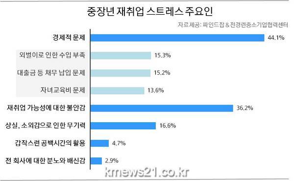 취업포털 파인드잡이 전경련중소기업협력센터(이하 ‘협력센터’)와 공동으로 40세 이상 중장년 1,032명을 대상으로 조사한 ‘2015년 중장년 재취업 인식조사’결과, 중장년 구직자들의 재취업 스트레스 체감지수는 평균 7.2점(10점 만점)으로 높은 수준이었으며, 스트레스를 높이는 가장 큰 이유는 ‘경제적 문제’ (44.1%)퇴직 후 팍팍한 노후 살림인 것으로 밝혀졌다.