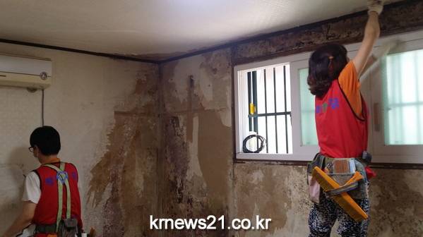 건축과 관계자 및 후원 건설사인 ㈜보광종합건설 직원들은 월피동 강00할머니 등 총 4가정의 도배, 장판, 세면기, 싱크대, 욕실 타일 수리 등을 실시했다.