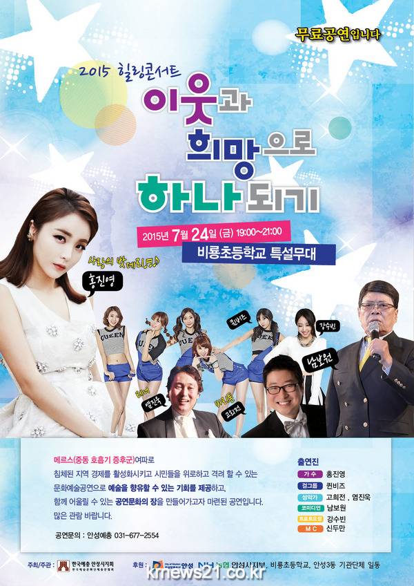 안성시는 오는 24일(금) 저녁 7시 비룡초등학교 특설무대에서 ‘이웃과 희망으로 하나 되기’라는 주제로 힐링 콘서트를 개최한다고 밝혔다.