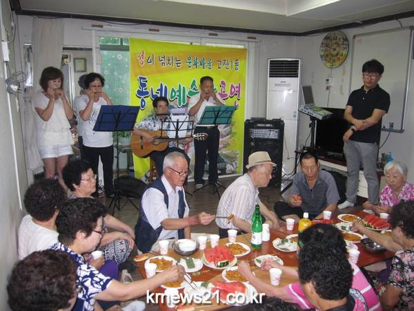 장마로 인한 궂은 날씨에도 불구하고 30여명의 어르신들이 참석하여 다과와 함께 공연을 즐겼고, 이날 공연에는 웃음치료를 통한 노래교실, 하모니카, 통기타 등 3개 팀이 참가하여 그 동안 갈고닦은 실력을 뽐냈으며, 특히 웃음치료를 통한 노래교실은 정겨운 노래와 친숙한 유머로 어르신들께 즐거움을 안겨줬다.