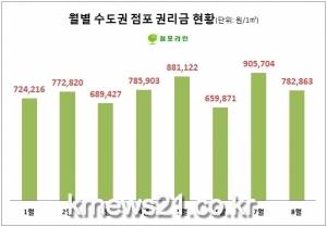 권리금을 월별로 봐도 상가 임대차보호법 개정안이 시행된 5월을 기점으로 오름세가 뚜렷했다. 수도권 소재 점포 권리금은 1월부터 4월까지 최저 68만 9000원(3월), 최고 78만 6000원(4월) 범위에서 오르내렸으나 이후 최고 90만 6000원(7월)까지 오르는 등 대체로 강세를 보였다.