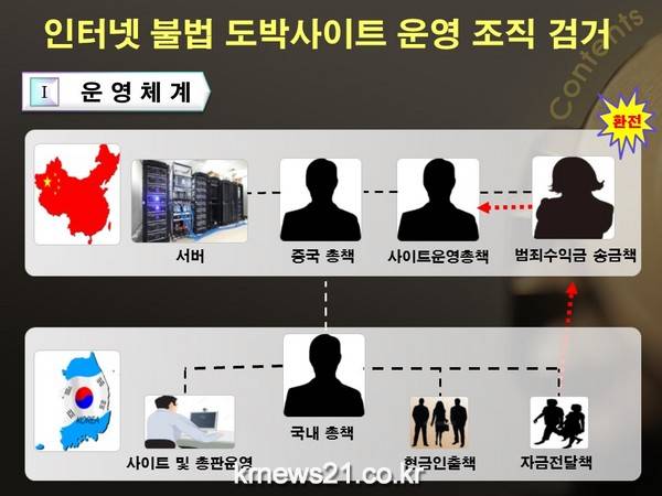 검거된 국내총책 성모 씨(46세, 남) 등은 중국에 있는 도박 사이트 운영자로부터 지시를 받아 하부조직인 ‘본사, ’총판‘, ’매장‘을 두고 관리를 해오면서 사이트를 홍보하기 위해 불특정 다수에게 무작위로 문자 메세지를 보내 회원을 확보한 뒤 수시로 도박금을 입금 받는 계좌를 변경하고, 입금된 도박자금을 200여개의 대포통장으로 분산하여 자금을 세탁한 후 국내 금융기관에서 현금으로 범죄 수익금을 인출하는 치밀함을 보였다.