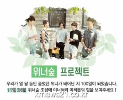 ‘위너 숲 프로젝트’는 팬들이 위너의 데뷔 일을 기념하기 위해 시작했으며, 공식 팬클럽이 생기기 전부터 SNS를 통해 숲 조성에 동참하고자 하는 팬들의 마음을 모았다.