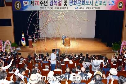 김포시는 역사적인 제70주년 광복절을 맞아 지난 8월 15일 오전 10시 30분 김포아트홀에서 광복회원 및 유가족과 보훈단체, 기관단체장, 평화문화도시위원회 위원, 시민 등 약 500여명이 참석한 가운데 「제70주년 광복절 경축행사 및 평화문화도시 선포식」을 성황리에 개최했다.