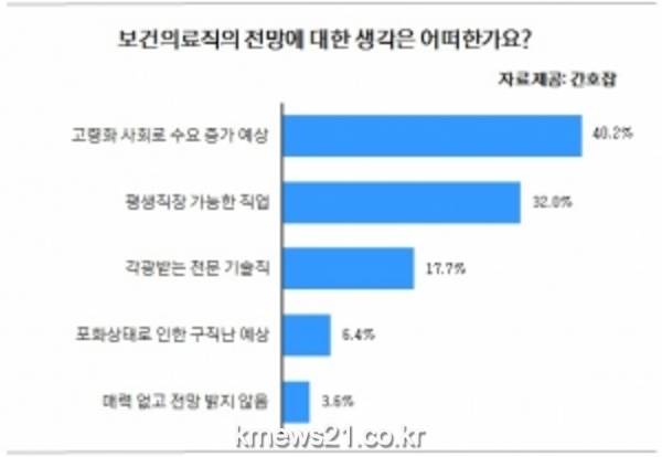 이와 함께 ‘평생직장이 가능한 직업’(32.0%)이 2위를, ‘각광받는 전문기술직’(17.7%)이 3위에 올라 1,2,3위를 합한 89.9%가 보건의료직 전망에 대해 긍정적으로 생각하고 있는 것으로 집계됐다.