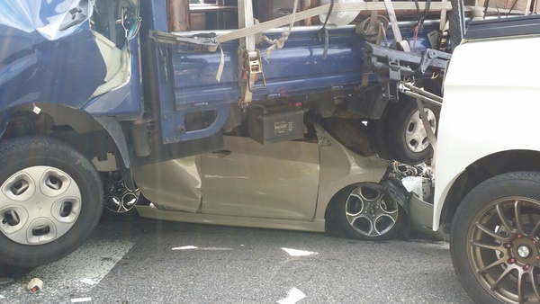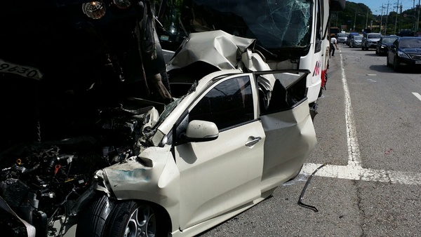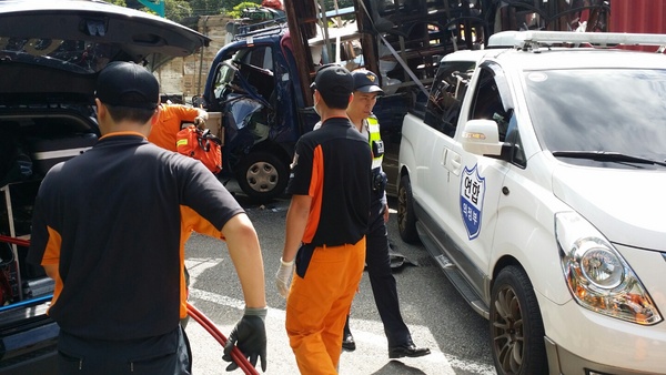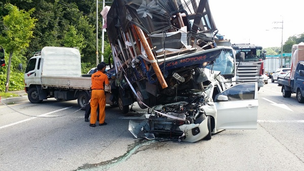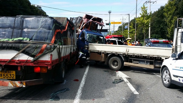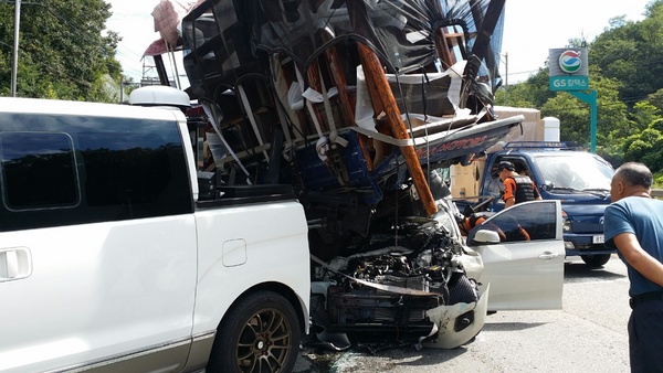 대형 화물차가 브레이크가 밀리면서 신호대기중이던 차량 4대를 추돌하였다.