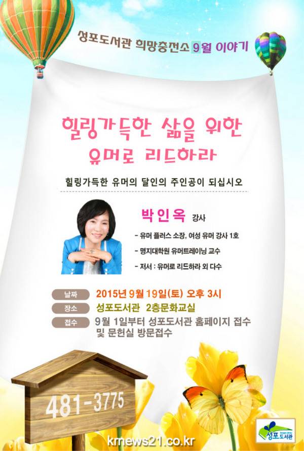 성포도서관 관계자는 “이번 강좌를 통해서 바쁜 일상 속에서 놓치기 쉬운 삶의 가치와 희망을 재충전하고, 웃음과 감동이 있는 즐거운 시간이 될 것”이라고 말했다.