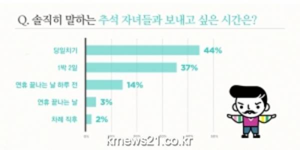 추석에 ‘자식들과 얼마나 오랜 시간을 함께 보내고 싶은가’라는 질문에 가장 많은 응답자인 44%가 ‘차례 후 한두 끼니 식사를 같이 하면 충분하다’고 응답한 것과 더불어 차례 끝나면 바로 헤어지는 게 좋다는 응답도 2%를 차지해, 총 46%의 응답자가 1박 미만, 즉 차례 당일 헤어지는 게 서로 편하다고 응답했다.
