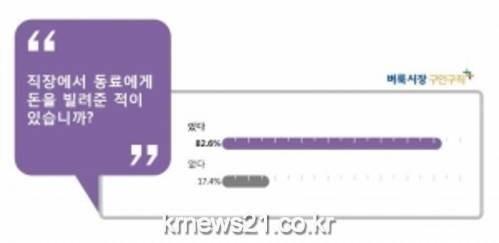 직장인 10명 중 8명 이상은 직장에서 동료에게 돈을 빌려준 적이 있으며 절반이 넘는 직장인은 직장 동료에게 빌려준 돈을 돌려 받지 못한 것으로 나타났다.
