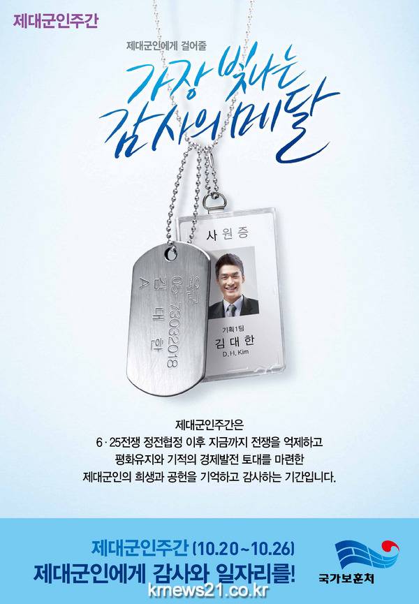 국가보훈처는 제대군인이 국토수호를 위해 헌신한 것에 대해 자긍심을 높이고, 국민들로 하여금 존경과 감사를 표하는 사회분위기를 조성하며, 제대군인에게 안정적인 일자리를 제공하고자 10월20일(화)부터 26일(월)까지 2015 「제대군인 주간」을 운영한다.
