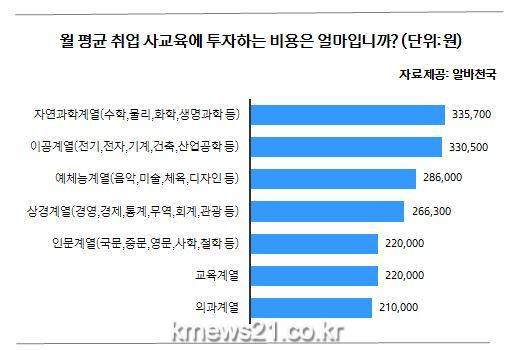아르바이트 전문포털 알바천국이 남녀 대학생 677명을 대상으로 ‘전공별 취업사교육비’에 대한 설문을 실시한 결과, 수학·물리 등을 전공하는 ‘자연과학계열’ 대학생이 월 평균 ‘33만 5700원’으로 가장 높은 사교육비를 지출하는 것으로 나타났다.