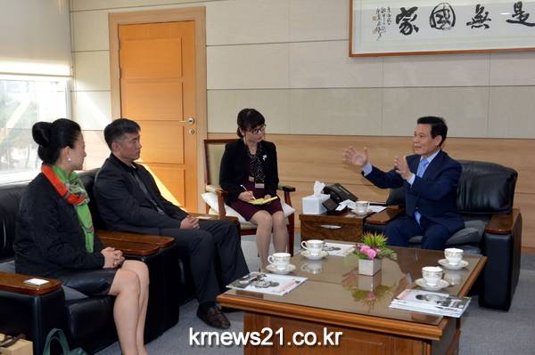 윤장현 광주광역시장은 20일 광주시청을 찾은 중국 만영그룹 스가이칭 회장 일행을 접견하고 상호 관심사를 논의했다.