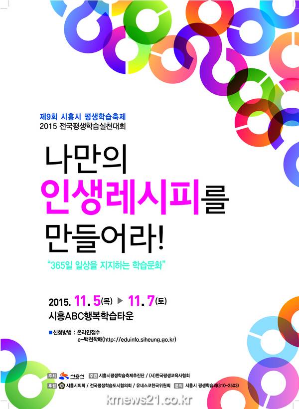 시흥시가 학술대회를 통한 상호학습의 장인 제9회 시흥시평생학습축제 ‘2015 전국 평생학습 실천대회’를 오는 11월 5일(목)부터 11월 7일(토)까지 3일 동안 시흥ABC행복학습타운에서 개최한다.