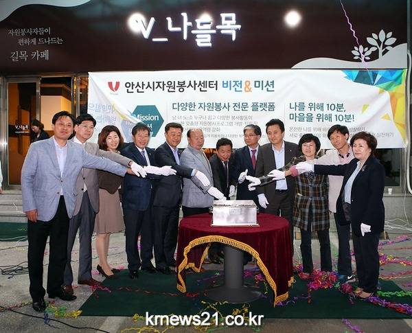 안산시 자원봉사센터(이사장 이종수)는 지난 10월 23일 와~스타디움내 새로운 보금자리를 마련해 자원봉사센터 사무실 이전식을 겸해 자원봉사자 카페인 V-나들목 개소식과 함께 비전선포식을 가졌다.