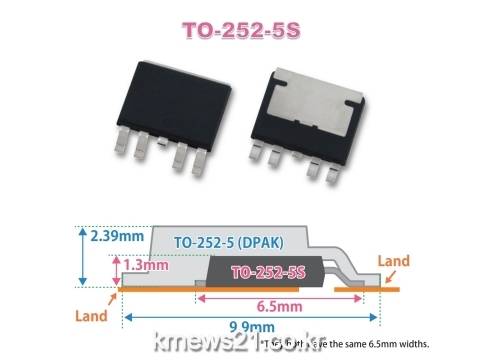이 신개발 소형 패키지 TO-252-5S는 기존 산업 표준 TO-252-3(DPAK) 패드(pad) 부분에 장착할 수 있으며, 거의 동일한 방열 기능을 보유하고 있으면서 35%의 장착면적 감소 및 50%의 높이 감축 기능도 실현한다.