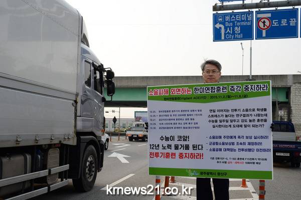 한미공군 연합 ‘Vigilant ACE 훈련’을 둘러싸고 광산구민들이 반발하고 있다. 주민들은 훈련이 끝나는 오는 금요일까지 지역 곳곳에서 1인 시위를 이어갈 예정이다.