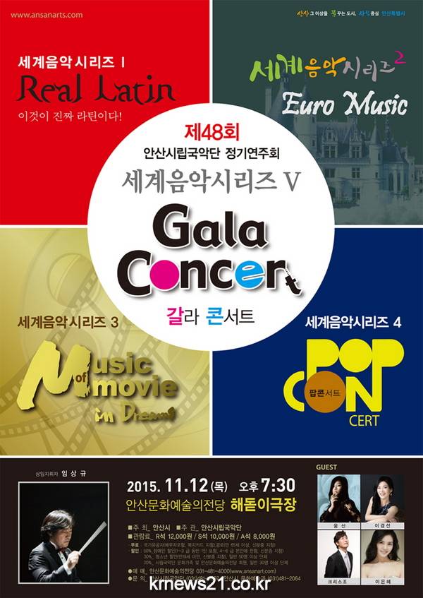안산시립 국악단(상임지휘자 임상규)은 오는 11월 12일 안산문화예술의전당 해돋이극장에서 제48회 정기연주회<</span>세계음악리즈Ⅴ-갈라 콘서트>로 2015년 대미 공연의 열정을 뿜어낸다.