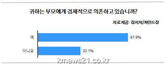 취업검색엔진 잡서치(대표 최인녕 www.job.co.kr)가 취업 전문포털 파인드잡(www.findjob.co.kr)과 공동으로 20대에서 30대 취업준비생 1,155명을 대상으로 ‘부모 경제적 의존도’에 대한 설문을 진행한 결과, 응답자의 67.9%가 현재 경제적으로 부모님에게 기대고 있는 ‘캥거루족’인 것으로 조사돼 눈길을 끈다.
