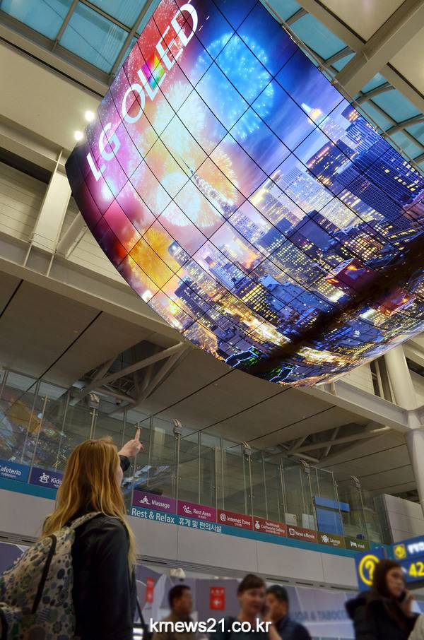 LG전자는 인천국제공항 여객터미널 3층 출국장 면세구역의 동편과 서편 두 곳에 각각 초대형 올레드 사이니지 ‘올레드 모멘트(OLED Moment)’를 설치했다. 천장에 설치된 ‘올레드 모멘트’에는 55형 곡면 올레드 140장씩 총 280장이 투입됐다. 이 조형물은 가로 8미터, 세로 13미터 길이의 웅장한 규모를 자랑한다. ‘올레드 모멘트’는 올레드 사이니지 중 세계 최대 규모다.