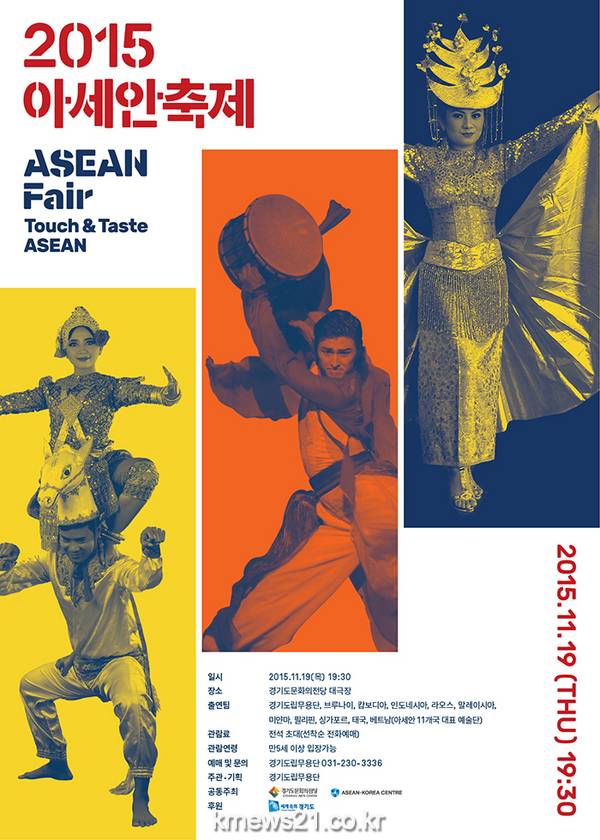 한-아세안센터(사무총장 김영선)는 경기도 문화의 전당(사장 정재훈)과 공동으로 19일 경기도 문화의 전당 대극장에서 ‘2015 아세안 축제’를 개최했다. 이날 행사에서는 아세안 10개국(브루나이, 캄보디아, 인도네시아, 라오스, 말레이시아, 미얀마, 필리핀, 싱가포르, 태국, 베트남) 국립 공연단 100여명이 각 국을 대표하는 민속·전통 무용, 가면극, 군무, 인형극, 전통 기악 공연을 선보였다. 또, 경기도립무용단이 한국 대표로 참여해 한국 춤이 지닌 곡선의 아름다움과 민속춤의 역동성을 부채춤과 농악무를 통해 선보였다.