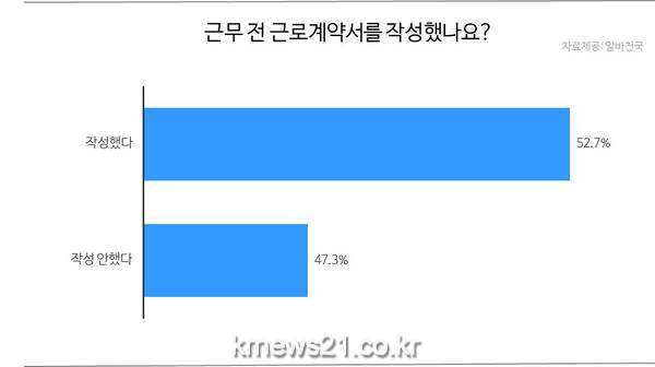 아르바이트 전문포털 알바천국(대표 최인녕 www.alba.co.kr)이 알바생 1,345명과 사업주 232명을 대상으로 진행한 ‘근로계약서 인식 현황’ 설문조사 결과 알바생 둘 중 한 명(47.3%)만이 근무하기 전 근로계약서를 작성했으며, 작성하지 않은 가장 큰 이유는 ‘고용주의 근로계약서 작성에 대한 언급이 없었기 때문’(55.2%)인 것으로 밝혀졌다.