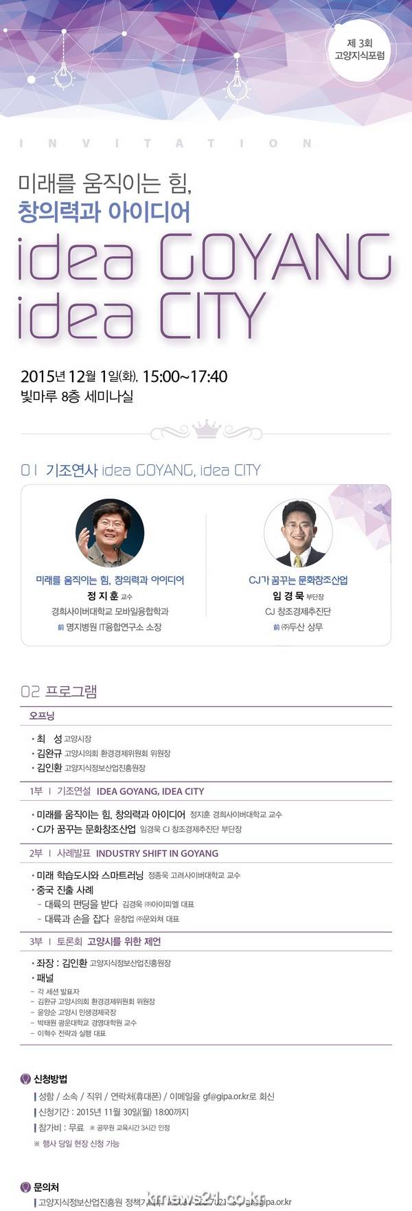 고양시(시장 최성)와 고양지식정보산업진흥원(원장 김인환, 이하 진흥원)은 12월 1일(화) 오후 3시부터 고양시 일산동구 장항동 방송지원센터 ‘빛마루’에서 「제 3회 고양지식포럼」을 개최한다.