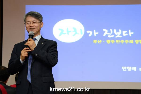 이에 앞서 민형배 광산구청장은 부산 동구의 초청을 받아 지난달 30일 부산 동구청에서 ‘자치가 진보다’를 주제로 강연했다. 민 구청장은 “스스로 다스려서 자유롭고 평화로운 자치공동체가 사람을 편안하게 하고 사람과의 관계를 좋게 만든다”고 부산지역 공직자 300여 명에게 주제의 의미를 설명했다.