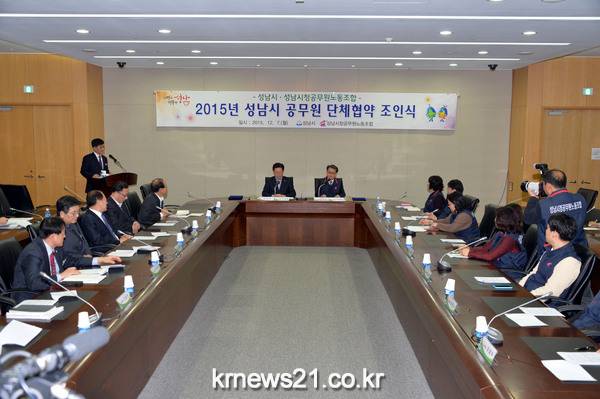 성남시와 성남시청공무원노동조합은 12월 7일 오후 5시 시청 3층 산성누리에서 제1차 성남시 공무원 단체협약 조인식을 열어 224개 항에 합의했다.