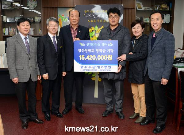 같은 날 수완 제2병원(병원장 고길석)은 광산장학회에 인재 육성기금 1,542만원을 전달했다. 기금은 수완 제2병원을 개원하면서 축하화환 대신 인재 양성을 위한 기부금을 받아 마련한 전액이다.