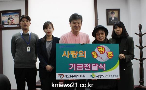 사랑모아통증의학과가 10일 오후 원내 5층 세미나실에서 ‘사랑의 홈런존’ 기금을 노인복지센터인 선우복지마을에 전달했다.