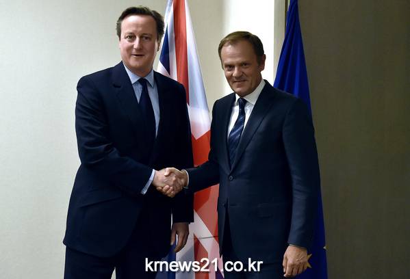 ▲ ⓒERIC VIDAL / POOL / AFP 데이비드 카메론 총리(좌)와 도날드 투스크 EU 상임의장(우)