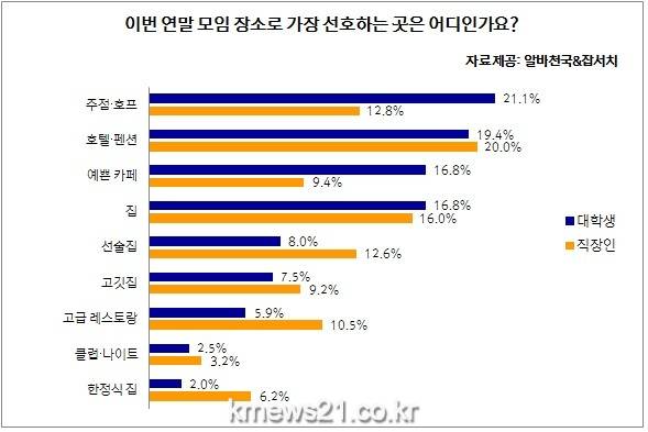 아르바이트 전문 포털 알바천국(대표 최인녕 www.alba.co.kr)이 취업검색엔진 잡서치와 함께 전국 대학생 612명, 직장인 531명을 대상으로 진행한 ‘선호하는 연말 모임 장소’ 설문조사에 따르면 대학생은 시끌벅적 에너지 넘치는 ‘주점·호프’(21.1%)를, 직장인은 지인들과 조촐한 파티를 열 수 있는 ‘호텔·펜션’(20.0%)을 1위로 꼽은 것으로 나타났다