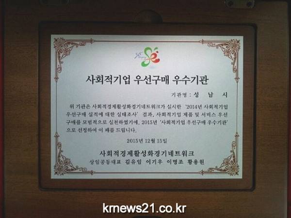 성남시(시장 이재명)는 사회적 기업 제품과 서비스 구매율이 경기도 내 1위인 것으로 나타나 12월 15일 오전 10시 고양시 킨텍스 제2전시장에서 열린 시상식에서 ‘우수기관 표창 패’를 받았다.