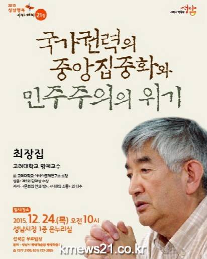 성남시(시장 이재명)는 오는 12월 24일 최장집 고려대 명예교수를 초빙해 올해 마지막 성남행복 아카데미 강연을 연다.