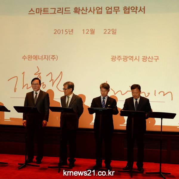 한편 이날 행사장에는 산업통상자원부, 광산구와 서울특별시를 비롯한 12개 지자체, 수완에너지(주), 한국전력 등 8개 컨소시엄 기업의 대표자가 참여해 스마트그리드 생태계 조성에 관한 업무협약식이 열렸다.