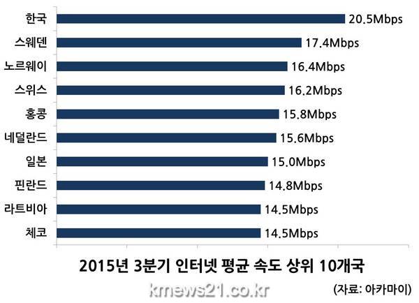 스웨덴(17.4Mbps)과 노르웨이(16.4Mbps)가 2위와 3위를 차지하며 북유럽 국가의 약진이 돋보였다. 2015년 3분기 전세계 인터넷 평균 속도는 5.1Mbps로 전년 동기 대비 14% 빨라졌다.