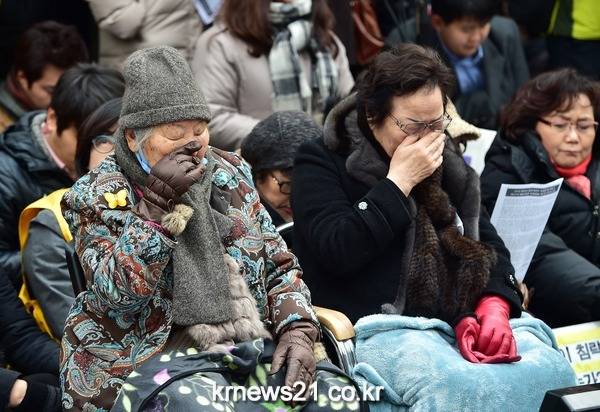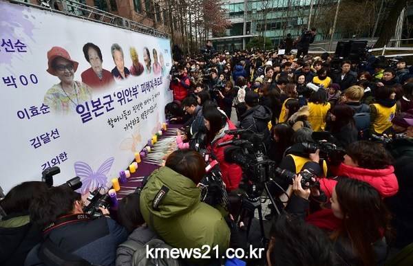 이용수·길원옥 등 위안부 피해 할머니 2명과 한국정신대문제대책협의회(정대협) 관계자, 대학생과 청소년 등 700여명의 참가자는 평소 수요 집회 때보다 더 격앙돼 있었다.