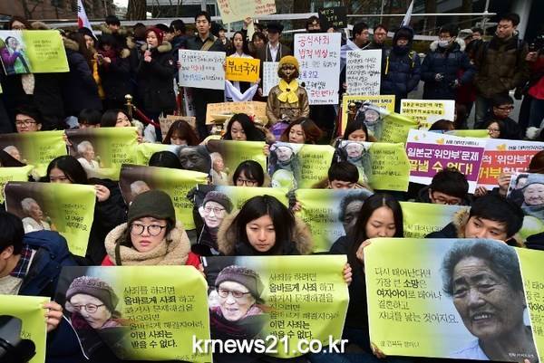이날 일본 대사관 앞에서 열린 '정기 수요 집회'는 한·일 정부의 위안부 합의에 대한 성토장이 됐다.