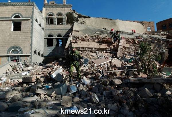 사우디아라비아가 주도한 공습으로 사나(예멘의 수도)에 무너진 상공 회의소 건물의 파편들을 점검하고 있는 군인.