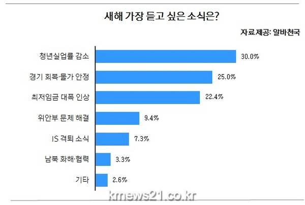 이 외 듣고 싶은 새해 소식으로는 ▲‘위안부 문제 해결’(9.4%), ▲‘IS 격퇴 소식’(7.3%), ▲‘남북 화해·협력’(3.3%) 등 국내·국제 사회에 관한 이슈들이 있었으며, ‘기타’ 응답은 2.6%였다.