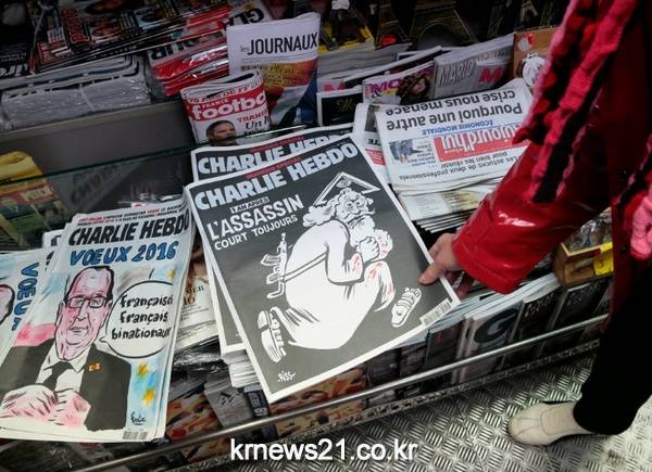 ▲ ⓒAFP / JACQUES DEMARTHON 프랑스의 만평 주간지 샤를리 에브로의 사무실이 테러 당한지 1년이 되는 해를 기념하기 위해 특집호를 발간했다.