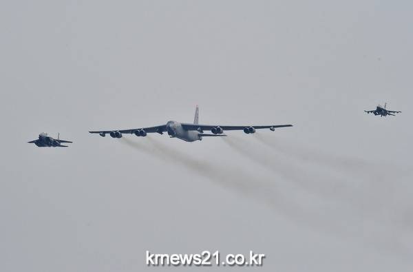하늘을 나는 요새라고 불리는 미 공군의 B-52 폭격기가 F-16과 함께 한국의 F-15 전투기와 오산 공군 기지에서 경계선 주변을 비행했다.