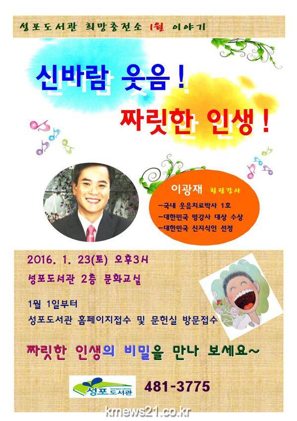 성포도서관은「희망충전소」1월의 이야기로 오는 1월 23일 오후 3시 성포도서관에서 국제 레크리에이션협회 이광재 대표를 초청하여 ‘신바람 웃음, 짜릿한 인생’이라는 주제로 특강을 실시한다.