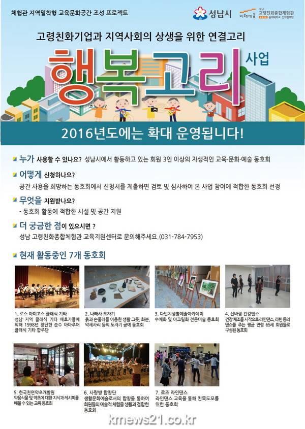 행복 고리 사업의 참여자격은 성남지역에서 활동중인 회원 3인 이상으로 구성된 동호회로 운영계획에 대한 심사를 거쳐 선정하게 된다. 주요 심사기준은 시니어 회원의 구성 비율과 지역사회 공헌도, 공간운용의 적정성 등이다.