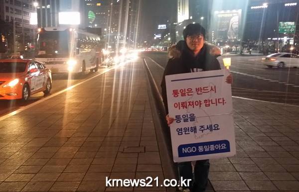 ‘NGO 통일 좋아요’ 신대경 대표가 매일 광화문에서 진행한 1인 통일 좋아요 촛불 캠페인이 100일째를 맞이했다.